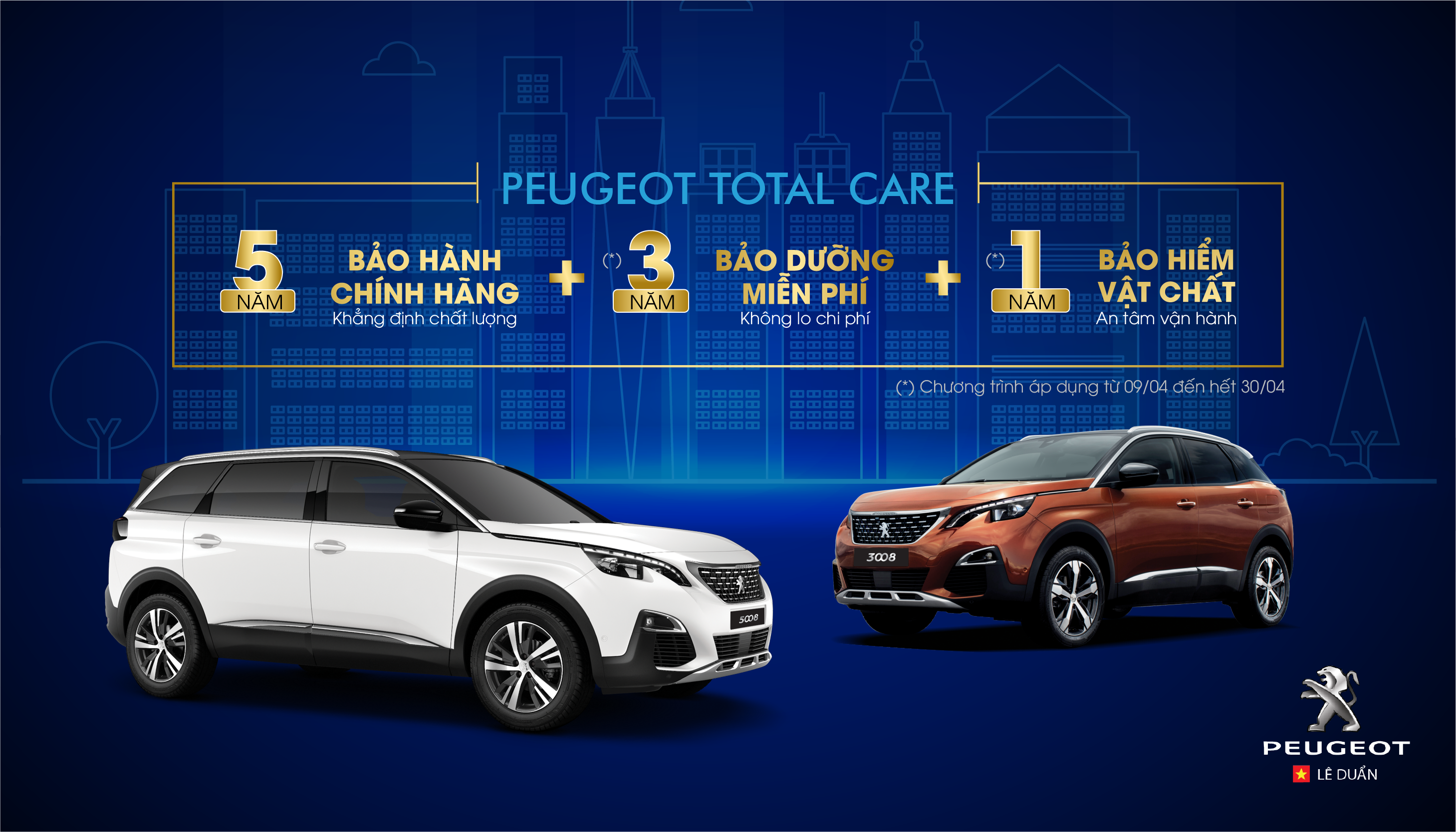 Từ ngày 9/4 đến ngày 30/4/2019, Peugeot Việt Nam tiếp tục chương trình Chăm sóc khách hàng toàn diện - Peugeot Total Care: khách hàng mua xe Peugeot 3008, Peugeot 5008 sẽ nhận được ưu đãi dịch vụ đặc biệt. Đây là 2 mẫu SUV góp phần lớn trong việc tạo dựng thương hiệu và thành công của Peugeot tại thị trường Việt Nam.
